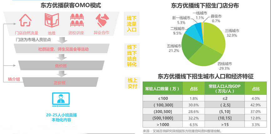 經(jīng)典案例:根據(jù)《20210621-艾瑞咨詢-教育行業(yè)2021年教育OMO發(fā)展趨勢報告:熱烈與冷靜》、艾瑞咨詢研究院等綜合資訊表明,東方優(yōu)播是新東方在線2017年3月推出的K12在線教育品牌,目標客戶為三到五線城市的高消費能力家庭。其向地面延伸獲客觸角,通過當?shù)氐木€下門店、進校講座等方式作為流量入口,進行本地化招生和服務(wù),同時依托北京的優(yōu)秀教學(xué)資源進行本地化的線上小班課程交付。據(jù)其2021財年半年報,截止至2020年11月30日,東方優(yōu)播已進入中國26個省的271個城市。