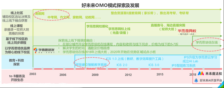經(jīng)典案例:根據(jù)《20210621-艾瑞咨詢-教育行業(yè)2021年教育OMO發(fā)展趨勢報告:熱烈與冷靜》、艾瑞咨詢研究院等綜合資訊表明,好未來自成立就帶有一定互聯(lián)網(wǎng)基因,2003年非典時期,好未來創(chuàng)始人張邦鑫自己創(chuàng)辦了交流社區(qū)“奧數(shù)網(wǎng)”,奧數(shù)網(wǎng)隨后成為了學(xué)而思線下小班的一個引流渠道并服務(wù)其線下校區(qū)開班選址,感受到線上優(yōu)勢的好未來此后通過購買或自建方式運營多個社區(qū)網(wǎng)站,如現(xiàn)在的家長幫、高考幫、考研幫,覆蓋不同年齡段用戶。