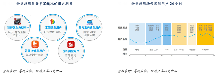 經(jīng)典案例:根據(jù)易觀分析、信達(dá)證券研發(fā)中心等綜合資訊表明,結(jié)合穿山甲與易觀聯(lián)合發(fā)布的《中國垂類應(yīng)用流量營銷價值洞察》,2020 年 11 月全網(wǎng)人均 每月使用 APP 個數(shù)為 25.2 個,各類 APP 使用時長較為平均,用戶觸達(dá)媒體呈現(xiàn)多元化與 碎片化特征。當(dāng)前垂類應(yīng)用正處高速成長期,社交電商、有聲閱讀、游戲平臺活躍用戶增速遠(yuǎn)高于全網(wǎng),2020 年 9 月垂類應(yīng)用使用時長僅次于騰訊系,占全網(wǎng)用戶使用總時長比例超 過 1/4。垂類應(yīng)用具備較高營銷價值。