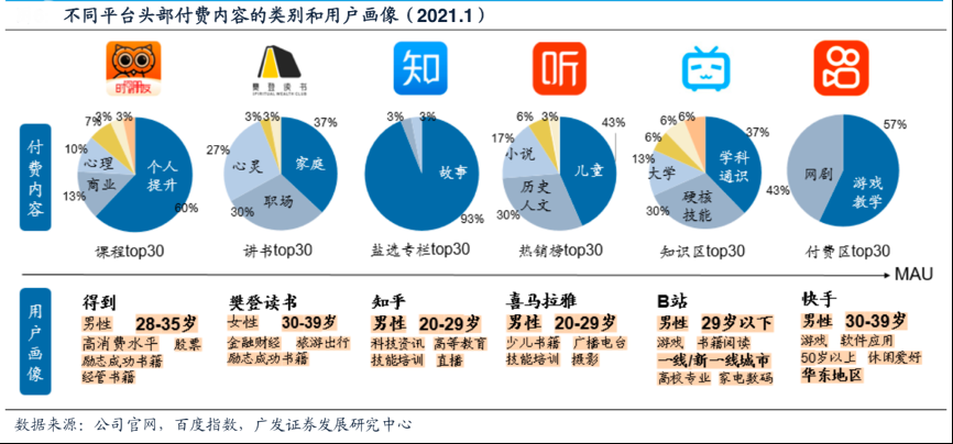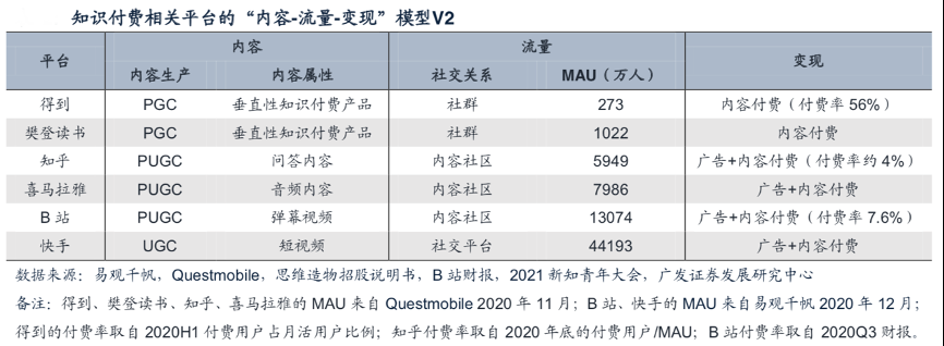 經(jīng)典案例:根據(jù)易觀千帆、Questmobile、思維造物招股說明書、B站財報、2021新知青年大會、廣發(fā)證券發(fā)展研究中心等綜合資訊表明,樊登讀書、得到、890商學(xué)院、混沌大學(xué)等垂直性知識付費平臺的內(nèi)容生產(chǎn)采用PGC模式,垂直性較強的產(chǎn)品內(nèi)容將用戶群限定在某個較窄的社群內(nèi),根據(jù)Questmobile,MAU最高的樊登讀書APP月活躍用戶在1000萬左右,其余APP的MAU均不足500萬,因此這類平臺難以向流量平臺躍遷,商業(yè)模型更接近教育機構(gòu),以內(nèi)容付費為主要盈利方式。