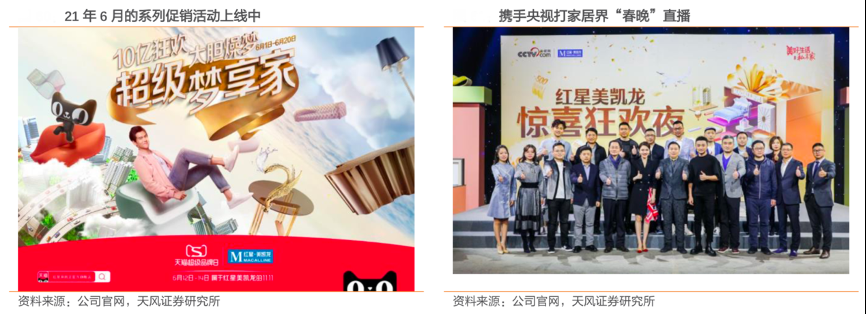 經(jīng)典案例:根據(jù)公司官網(wǎng)、天風(fēng)證券研究所等綜合資訊表明,美凱龍依托強(qiáng)大的平臺優(yōu)勢和筋斗云的數(shù)字營銷系統(tǒng),構(gòu)建了全民營銷、社群矩陣、自媒體矩陣、直播營銷矩陣等,精準(zhǔn)觸達(dá)用戶。1)全民營銷平臺:云集 25萬商場導(dǎo)購、家裝設(shè)計(jì)師和家裝 KOL,全年為各大全場活動、品類節(jié)活動、品牌日活動、聯(lián)盟活動帶來 超 198 萬精準(zhǔn)參團(tuán)人數(shù);2)社群矩陣:覆蓋全國 353 萬精準(zhǔn)家裝用戶的 2.8 萬個(gè)中高端樓 盤業(yè)主群,社群渠道人均消費(fèi)總額比非社群渠道高出 47%,并為各類活動引流超過 102.7 萬人;3)直播營銷矩陣:囊括約 5000 位家裝家居專業(yè)主播,2020年共開播 7.8 萬場,商家線上推廣、種草與轉(zhuǎn)化效率顯著增長,用最短的營銷鏈路為商家提效。