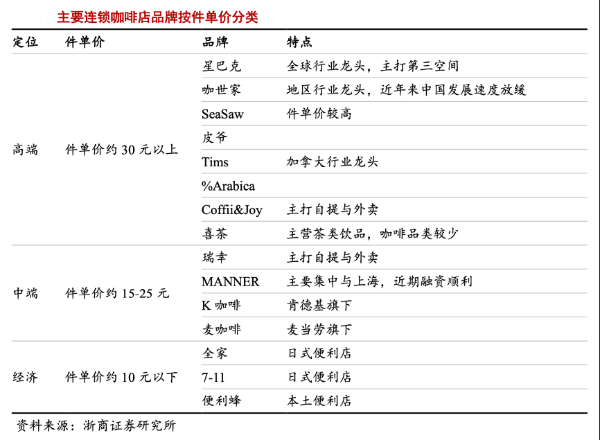 經(jīng)典案例:根據(jù)浙商證券研究所等綜合資訊表明,按照件單價(jià),可將中國(guó)連鎖咖啡店品牌分為三大類:高端品牌:30元以上,以星巴克、咖世家為代表;中端品牌:15-25元,以瑞幸、MANNER 為代表;經(jīng)濟(jì)型品牌:以便利店售賣咖啡為代表。各品牌大多涉及“主流品類經(jīng)營(yíng)”。