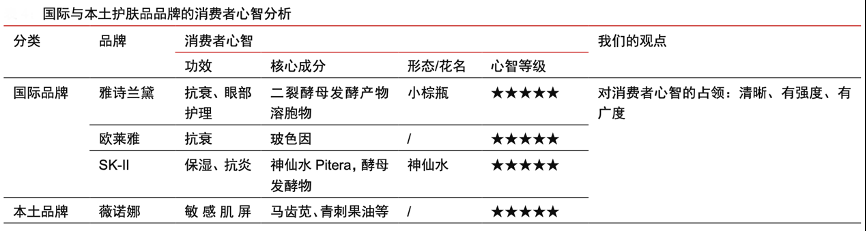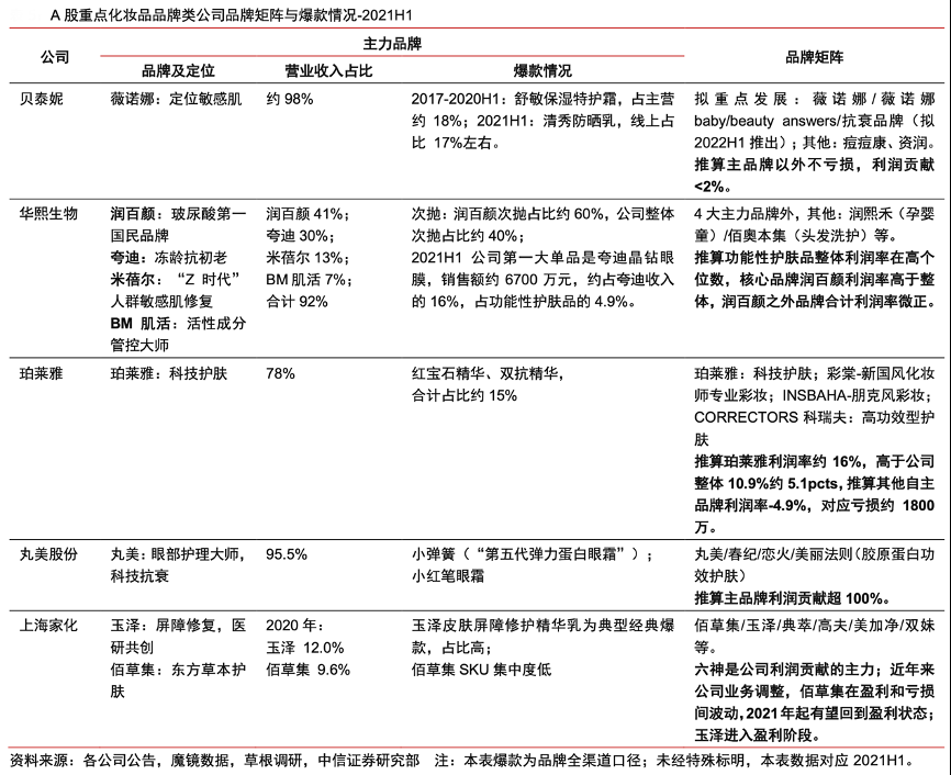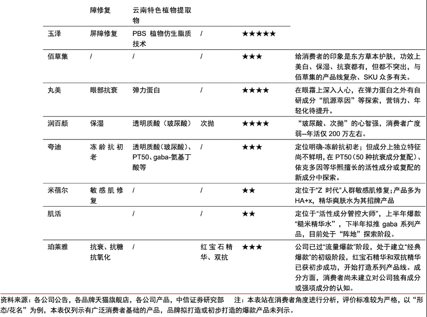 經(jīng)典案例:根據(jù)各公司公告、各品牌天貓旗艦店、各公司產(chǎn)品、中信證券研究部等綜合資訊表明,成功的化妝品品牌必須在特定概念、成分、功效、場景等方面占領(lǐng)消費(fèi)者心智。當(dāng)消費(fèi)者提及某概念、成分、功效或場景時(shí),首先想到的是該品牌,甚至將品牌與其畫等號。本土A股化妝品品牌類公司,多數(shù)已建立自己的“陣地”,并不斷拓寬護(hù)城河,夯實(shí)陣地。