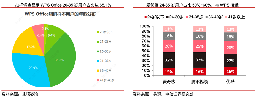 經(jīng)典案例:根據(jù)艾瑞咨詢(xún)、易觀、中信證券研究部等綜合資訊表明,結(jié)合2018 年艾瑞咨詢(xún)針對(duì) 2065 名 WPS Office 用戶(hù)做的抽樣調(diào)查顯示,WPS Office 用戶(hù)群中 26-35 歲用戶(hù)占比達(dá) 65.1%。這一年齡段屬于社會(huì)核心勞動(dòng)人群,處在收入上升期,兼具提升工作效率的需求與消費(fèi)能力,89 元/年的 WPS 會(huì)員以及 179 元/年的超級(jí)會(huì)員對(duì)這部分用戶(hù)構(gòu)成的消費(fèi)壓力相對(duì)有限。
