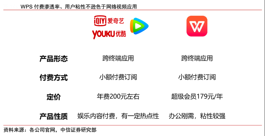 經(jīng)典案例:根據(jù)各公司官網(wǎng)、中信證券研究部等綜合資訊表明,WPS目前正通過產(chǎn)品服務(wù)體驗(yàn)、中長(zhǎng)期付費(fèi)引導(dǎo)等方式,促進(jìn)用戶從“為功能付費(fèi)”轉(zhuǎn)向“為服務(wù)付費(fèi)”,云服務(wù)可以進(jìn)一步提升跨終端應(yīng)用的用戶體驗(yàn)及使用粘性,培養(yǎng)用戶長(zhǎng)期付費(fèi)使用習(xí)慣。整體看,WPS 的付費(fèi)滲透率和用戶粘性應(yīng)不遜色于網(wǎng)絡(luò)視頻應(yīng)用,其核心用戶群的長(zhǎng)期付費(fèi)轉(zhuǎn)化率有更大空間。