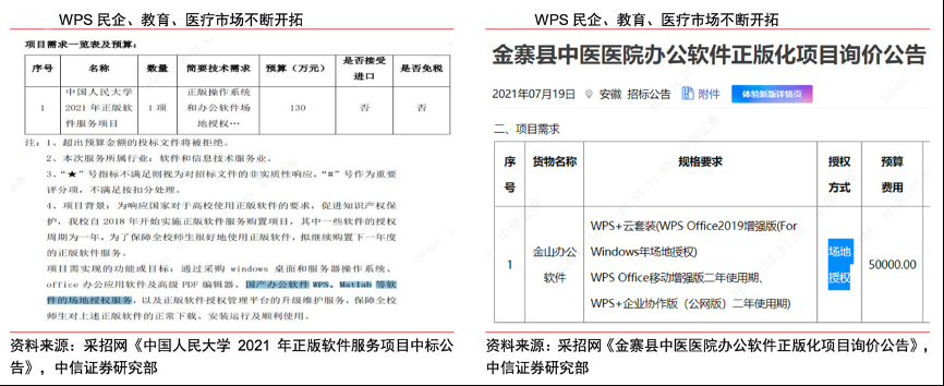 經(jīng)典案例:根據(jù)采招網(wǎng)、中信證券研究部等綜合資訊表明,此前金山辦公公司授權(quán)業(yè)務(wù)主要專注于黨政、央企、國(guó)企市場(chǎng),在微軟相對(duì)強(qiáng)勢(shì)的民企市場(chǎng)并未重點(diǎn)開拓。根據(jù)公司渠道合作伙伴大會(huì)披露信息,2021年以來金山公司渠道超過 2000 家。2021年中報(bào)業(yè)績(jī)交流會(huì)上公司表示目前正在積極推進(jìn)民企、教育、醫(yī)療等市場(chǎng)的銷售,擴(kuò)大市場(chǎng)覆蓋范圍,有望在明年迎來增量收入,相關(guān)領(lǐng)域開拓進(jìn)展參考采招網(wǎng)上訂單信息有所印證。