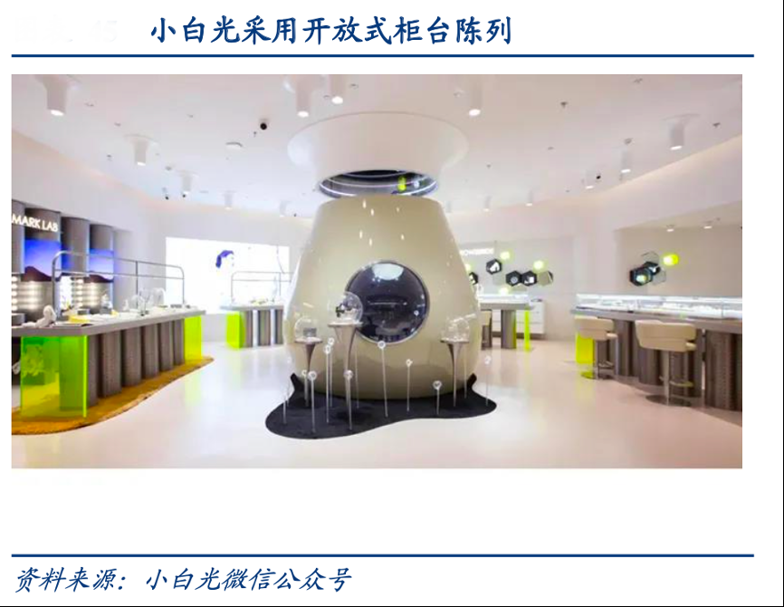 經(jīng)典案例:根據(jù)小白光微信公眾號、華創(chuàng)證券等綜合資訊表明,小白光的線下門店開創(chuàng)沉浸式鉆石體驗?zāi)J?,通過網(wǎng)絡(luò)預(yù)約進(jìn)店可享受專屬接待,店內(nèi)采用開放式柜臺陳列,并給顧客提供網(wǎng)紅化妝臺進(jìn)行自由佩戴,帶給年輕消費者沉浸式體驗,同時在營銷上,對于在門店購買 1 克拉鉆石的顧客,可以贈 送天上 1 顆星星的命名權(quán),豐富產(chǎn)品形式。
