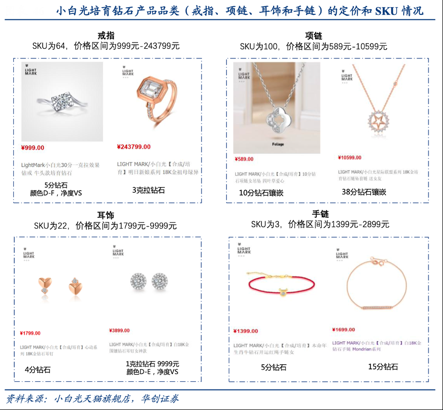 經(jīng)典案例:根據(jù)小白光天貓旗艦店、華創(chuàng)證券等綜合資訊表明,小白光產(chǎn)品多元,價格定位“可負(fù)擔(dān)”,滿足不同消費場景下的消費者需求。線下門店展廳有鉆戒項鏈區(qū)(婚慶場景)和首飾區(qū)(配飾場景),線上天貓旗 艦店的界面也區(qū)分了婚戒系列、鉆戒系列和飾品系列;定價上,小白光堅持“年輕人可 負(fù)擔(dān)的奢侈”的品牌初心,對于需要購買鉆石作為禮品的消費者,可以提供 1 萬元以上 的產(chǎn)品,對于需要購買鉆石作為飾品的消費者,可以提供1000-3000 元的產(chǎn)品,滿足不同場景下的消費者需求。