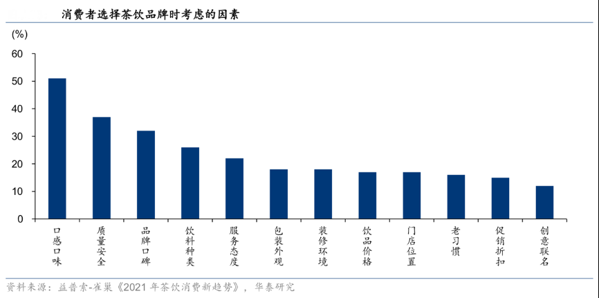經(jīng)典案例:根據(jù)益普索聯(lián)合雀巢發(fā)布的《2021 年茶飲消費(fèi)新趨勢(shì)》、華泰研究等綜合資訊表明,有51/37%的消費(fèi)者購(gòu)買茶飲產(chǎn)品時(shí)將產(chǎn)口感口味/品質(zhì)及食品安全作為考慮因素。新式茶飲采用茶葉、鮮奶、鮮果等天然優(yōu)質(zhì)食材為原料,引入更多配料與風(fēng)味,整體品質(zhì)較傳統(tǒng)茶飲得到提高。