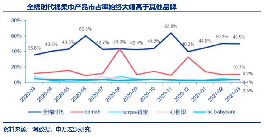 經典案例:根據(jù)淘數(shù)據(jù)、申萬宏源研究等綜合資訊表明,以明星產品棉柔巾為例:2020年3月至2021年3月,淘寶全網棉柔巾/洗臉巾銷 售額排名前五的品牌分別為全棉時代、damah、得寶、心相印、bc babycare。其中,全棉時代棉柔巾成交金額5.6億元,市場份額50.1%,斷層式超越其他品牌,具有絕對龍頭的市場地位。