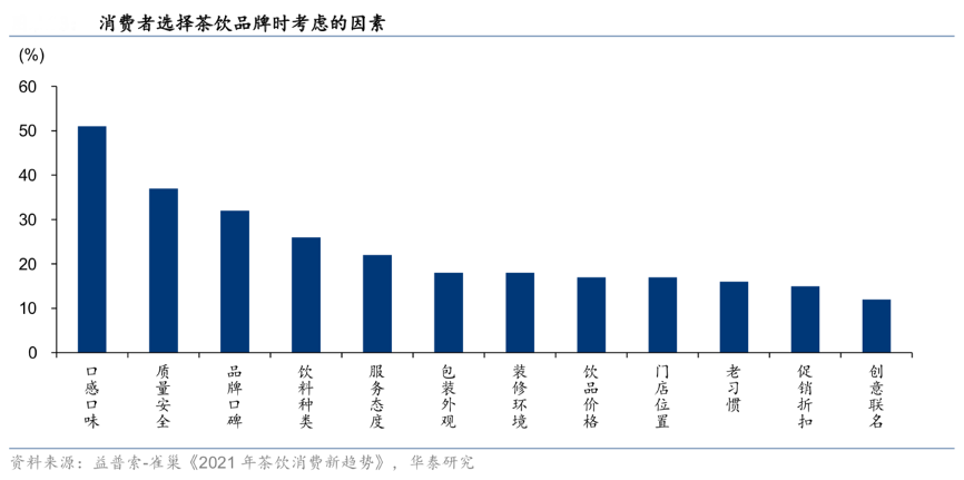 經(jīng)典案例:根據(jù)益普索聯(lián)合雀巢發(fā)布的《2021 年茶飲消費(fèi)新趨勢》、華泰研究等綜合資訊表明,有51/37%的消費(fèi)者購買茶飲產(chǎn)品時(shí)將產(chǎn)口感口味/品質(zhì)及食品安全作為考慮因素。新式茶飲采用茶葉、鮮奶、鮮果等天然優(yōu)質(zhì)食材為原料,引入更多配料與風(fēng)味,整體品質(zhì)較傳統(tǒng)茶飲得到提高。
