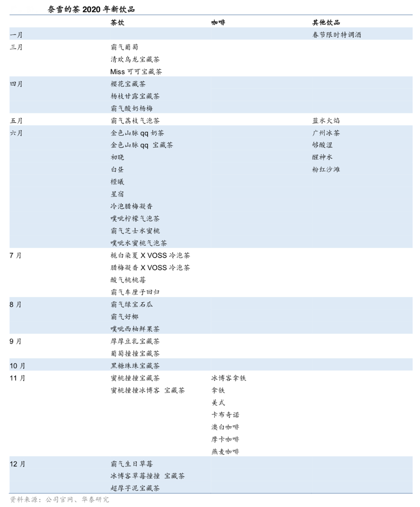 經(jīng)典案例:根據(jù)公司官網(wǎng)、華泰研究等綜合資訊表明,奈雪的茶為保證產(chǎn)品新鮮度,其圍繞核心菜單不斷創(chuàng)新,平均每周推出一款新品,2018年以來(lái)共推出 60 種季節(jié)性產(chǎn)品。2020年,其三大最暢銷(xiāo)季節(jié)性茶飲霸氣芝士水蜜桃、霸氣 楊梅、霸氣芝士綠寶石蜜瓜共售出5,700萬(wàn)杯。