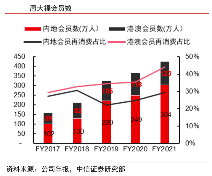 經(jīng)典案例:根據(jù)公司年報、中信證券研究部等綜合資訊表明,隨著悅己消費興起,消費者購買黃金珠寶不僅僅是因為婚嫁等偏剛需的屬性,也會因為從自己的開心出發(fā),去購買更具設(shè)計感、更有產(chǎn)品內(nèi)涵的珠寶。周大福近三年會員再消費占比不斷上升,悅己消費興起驅(qū)動品牌復(fù)購的提高,用戶粘性不斷增加。