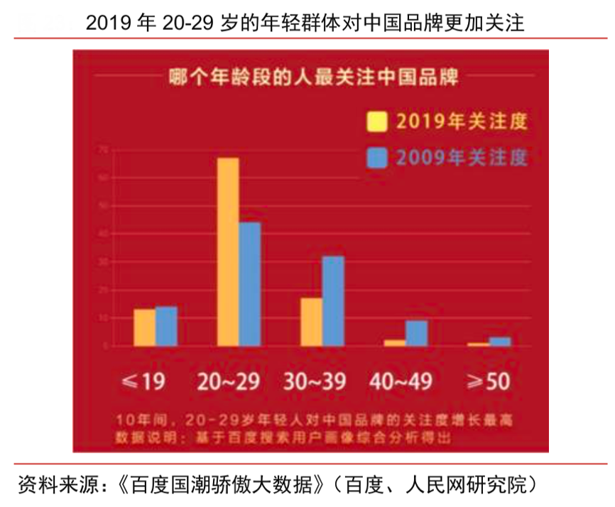 經(jīng)典案例:根據(jù)百度、人民網(wǎng)研究院《百度國潮驕傲大數(shù)據(jù)》、中信證券研究部等綜合資訊表明,古法金是采用古老的鍛金工藝技術(shù)制成,質(zhì)感十足,其走紅反映了消費者在國潮復(fù)興下對傳統(tǒng)文化的認同,相比較 2009 年,2019 年的 20-29 歲年輕群體對中國品牌更加關(guān)注,古法金飾品作為中國傳統(tǒng)制金工藝傳承的重要載體,滿足了消費者文化層面的消費需求。