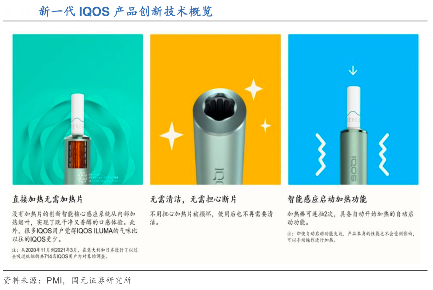 經典案例:根據(jù)PMI、國元證券研究所等綜合資訊表明,IQOS ILUMA作為PMI新一代無煙未來的“使命承載者”同時被譽為迄今為止最具創(chuàng)新的“革命性”產品,其采用了多項創(chuàng)新技術,其中最重要的是摒棄了傳統(tǒng)加熱薄片來加熱煙彈的方式,在新設備中使用了 SMARTCORE INDUCTION SYSTEM,使得可以在沒有加熱片的情況下實現(xiàn)內部加熱煙葉。同時由于新設備中不含加熱薄片,因此不會出現(xiàn)斷片的情況,也不需要像傳統(tǒng) IQOS 產品一樣進行清潔。