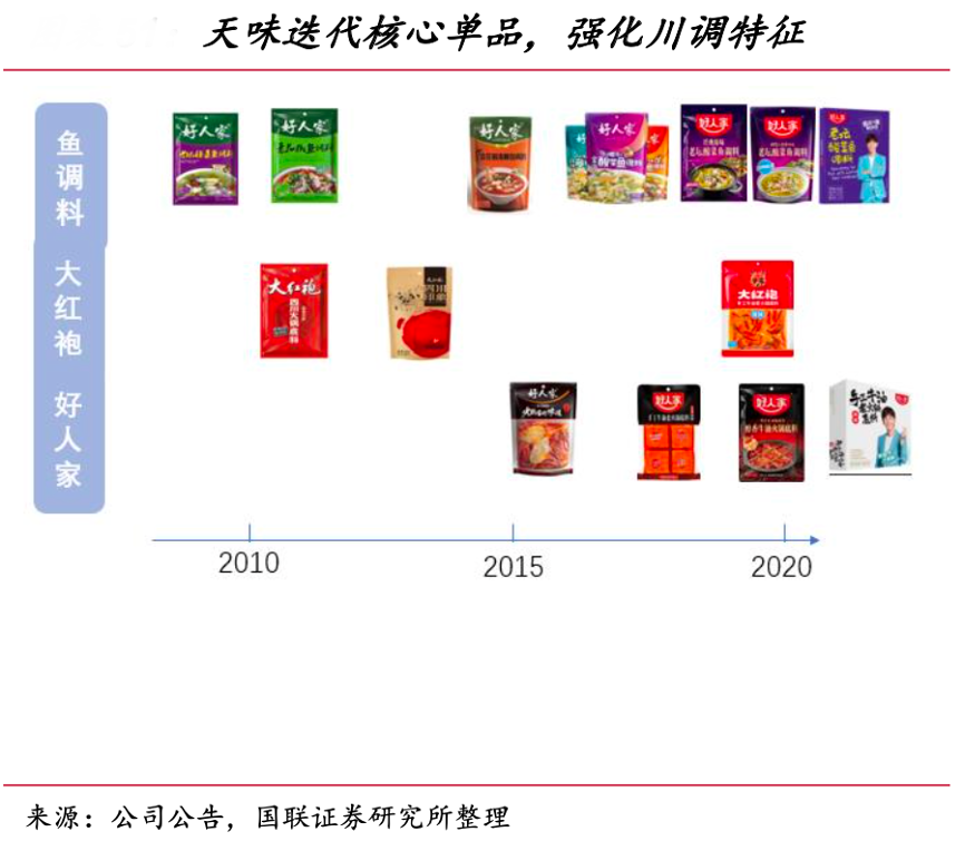 經(jīng)典案例:根據(jù)公司公告、國(guó)聯(lián)證券研究所等綜合資訊表明,天味主要圍繞多款核心大單品進(jìn)行升級(jí)迭代,不斷強(qiáng)化產(chǎn)品力,同時(shí)也在不斷強(qiáng)化公司川味復(fù)調(diào)料的品牌特性。其中,其大單品魚(yú)調(diào)料自 2009 年起在 12 年間 經(jīng)歷近 7 次口味或包裝迭代,兩大子品牌的火鍋底料也各自進(jìn)行了 3-4 次產(chǎn)品更新。
