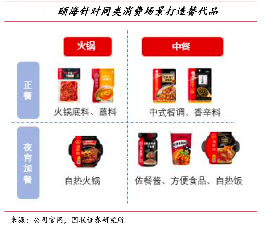 經(jīng)典案例:根據(jù)公司官網(wǎng)、國(guó)聯(lián)證券研究所等綜合資訊表明,頤海在產(chǎn)品開(kāi)發(fā)上更為注重同類消費(fèi)需求下不同場(chǎng)景的產(chǎn)品挖掘,擴(kuò)展?jié)摿Ω鼜?qiáng)。復(fù)合調(diào)味品消費(fèi)者主要是對(duì)口味有追求、烹飪能力和時(shí)間相對(duì)有限的年輕群體,因此頤海在品類擴(kuò)容上選中方便食品作為第二核心,同樣針對(duì)此類群體在較為常見(jiàn)的夜宵、加班、加餐等場(chǎng)景下的消費(fèi)需求打造了沖泡、休閑食品。