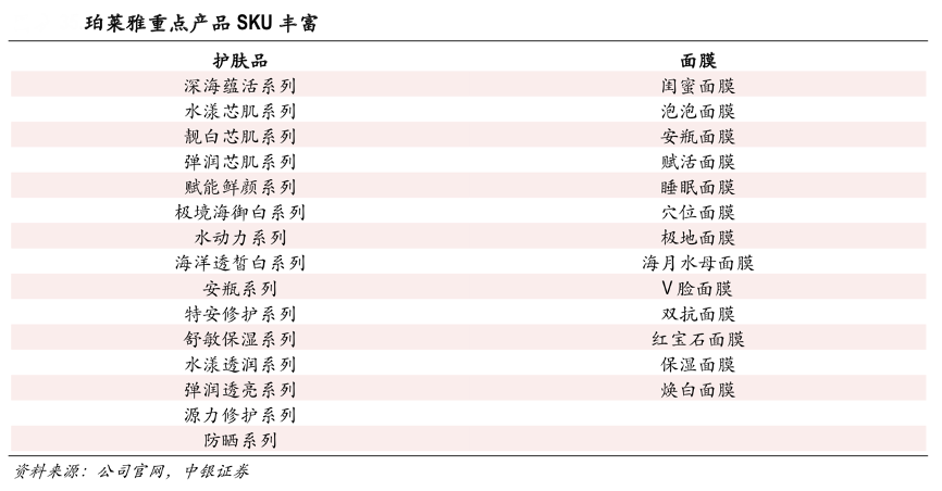 經(jīng)典案例:根據(jù)公司官網(wǎng)、中銀證券等綜合資訊表明,珀萊雅公司主品牌“珀萊雅”主打護膚品及面膜,自 2017 年以來其加速推出新品,包括靚白芯肌系列、賦能鮮顏系列、煙酰胺美白精華、膠原蛋白線雕精華、深海保濕酵母原液、極境專效修護面膜等,產(chǎn)品 SKU愈加豐富,對應(yīng)珀萊雅公司2017-2020 年收入均有顯著提升,同比增速分別為 10.75%/32.38%/26.82%/12.43%(2015-2016 年收入增速分別為 1.29%/-1.25%)。