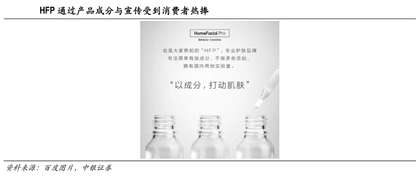 經(jīng)典案例:根據(jù)百度圖片、中銀證券等綜合資訊表明,借助于 KOL 的宣傳與推廣,不少國有品牌迅速獲得消費者關(guān)注。以 Home Facial Pro 為例,公司依托熱門成分(煙酰胺、寡肽原液和乳糖酸原液等)以及微博與微信等KOL 推廣,上市僅四年就已經(jīng)年銷量達超過 10 億。