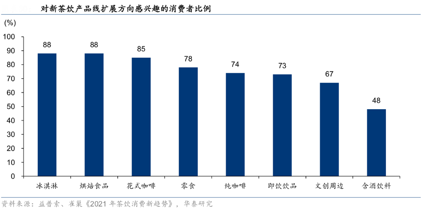 經(jīng)典案例:根據(jù)益普索雀巢《2021年茶飲消費(fèi)新趨勢》、華泰研究等綜合資訊表明,新茶飲領(lǐng)先品牌產(chǎn)品類別已拓展至茶飲外的品類,包括冰淇淋、烘焙食品、花式 咖啡、零售、即飲飲品等其,甚至拓展到文創(chuàng)周邊等非餐飲品類。這不但可擴(kuò)展品牌的消費(fèi)時(shí)間與場景,還可為消費(fèi)者提供更多維度的體驗(yàn)。據(jù)益普索、雀巢聯(lián)合發(fā)布的《2021 年 茶飲消費(fèi)新趨勢》,分別有 88%、88%、85%的消費(fèi)者對新茶飲品牌推出的冰淇淋、烘焙食品、花式咖啡感興趣。