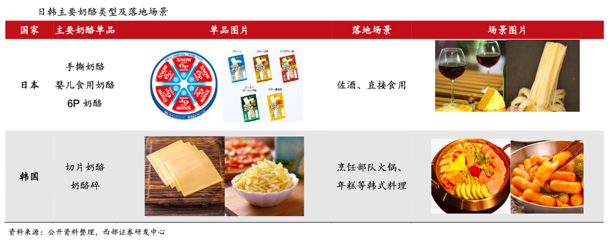 經(jīng)典案例:根據(jù)公開資料、西部證券研發(fā)中心等綜合資訊表明,日韓競爭格局的差異源于奶酪在兩國不同的落地場景,零食端餐桌端來看,日本零食奶酪發(fā)展蓬勃,手撕奶酪、嬰兒食用奶酪、6P 奶酪等零食大單品百花齊放,我國奶酪 C 端市場與日本相似,目前由零食端占據(jù)主導(dǎo),具備孕育行業(yè)龍一的市場環(huán)境。