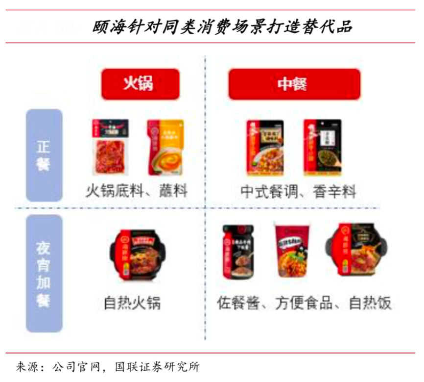 經(jīng)典案例:根據(jù)公司官網(wǎng)、國聯(lián)證券研究所等綜合資訊表明,頤海在產(chǎn)品開發(fā)上更為注重同類消費需求下不同場景的產(chǎn)品挖掘,擴展?jié)摿Ω鼜?。復合調(diào)味品消費者主要是對口味有追求、烹飪能力和時間相對有限的年輕群體,因此頤海在品類擴容上選中方便食品作為第二核心,同樣針對此類群體在較為常見的夜宵、加班、加餐等場景下的消費需求打造了沖泡、休閑食品。