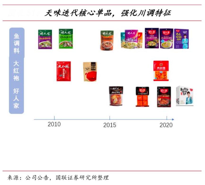 經(jīng)典案例:根據(jù)公司公告、國聯(lián)證券研究所等綜合資訊表明,天味主要圍繞多款核心大單品進行升級迭代,不斷強化產(chǎn)品力,其大單品魚調(diào)料自 2009 年起在 12 年間經(jīng)歷近 7 次口味或包裝迭代,兩大子品牌的火鍋底料也各自進行了 3-4 次產(chǎn)品更新。