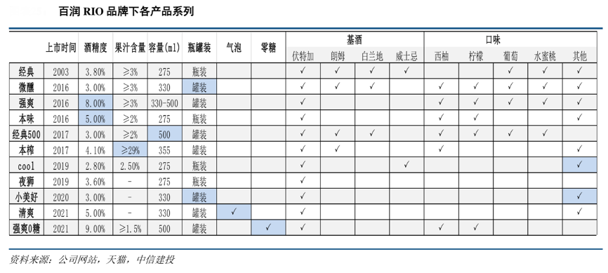 經(jīng)典案例:根據(jù)公司網(wǎng)站、天貓、中信建投等綜合資訊表明,百潤公司通過酒精度數(shù)、瓶罐裝設(shè)計、容量、果汁含量劃分產(chǎn)品系列,再通過果汁種類、 基酒原料等,豐富各個產(chǎn)品系列。目前 RIO 品牌的產(chǎn)品系列覆蓋2.8%-9%酒精度數(shù)、瓶灌裝包裝、2%-29%果汁含量、275-500ml容量、有無氣泡、是否零糖、多種基酒、多種口味,有助于實現(xiàn)公司在預(yù)調(diào)雞尾酒行業(yè)的全方位布局。2020 年 8.18-11.29 期間,美好生活系列的 GMV 總計2427 萬,平臺曬單率高達(dá) 80%。