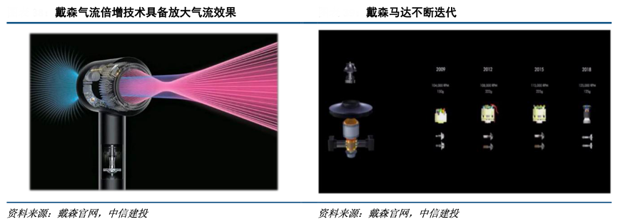 經(jīng)典案例:根據(jù)戴森官網(wǎng)、中信建投等綜合資訊表明,戴森通過改進空氣動力形態(tài),形成“康達效應”達到更大風量的目的,使得吹出的風速相較于實際流速增大了 16 倍左右,使其在外形設計、風力制造和能量節(jié)約方面卓然領先于市場,定價于3000+元的市場,并獲得了消費者的認可。同時,其投入 3.5 億英鎊用于馬達的 研究,在進一步提升吸力的同時,直接促成了產(chǎn)品形態(tài)向無繩化轉(zhuǎn)變。