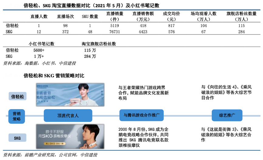 經(jīng)典案例:根據(jù)淘數(shù)據(jù)、小紅書、前瞻產(chǎn)業(yè)研究院、公司官網(wǎng)、中信建投等綜合資訊表明,倍輕松不僅通過邀請代言人對品牌進行代言,邀請頭部主播為品牌直播帶貨,同時進行綜藝贊助提升品牌知名度,其整體營銷方式多樣,小紅書、淘寶直播、抖音等渠道均有大量的內(nèi)容營銷投入。其和SKG均采用積極的營銷方式,其中 SKG 對線上營銷的投入更大,營銷推廣的次數(shù)和力度均較強。