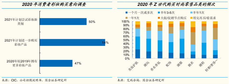 經(jīng)典案例:根據(jù)CIC、公司招股說明書、艾瑞咨詢、國(guó)金證券研究所等綜合資訊表明,隨著流行品位的不斷更迭與社交媒介美妝教育 不斷普及,年輕消費(fèi)群 體傾向于 持續(xù)擴(kuò)充其化妝品種類與風(fēng)格,新需求高頻迭代。艾瑞咨詢數(shù)據(jù)顯示,2020年 Z 世代購(gòu)買的時(shí)尚零售品類中,美妝護(hù)膚類產(chǎn) 品購(gòu)買頻率最高。24.5%的受訪者一個(gè)月內(nèi)至少購(gòu)買一次,33.8%的受訪者半 年內(nèi)購(gòu)買 3-5 次。按各區(qū)段最低頻次計(jì)算,Z 世代平均一年至少需購(gòu)買 5.5 次 化妝品,購(gòu)買頻次高于潮玩的每年 5 次。