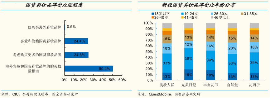 經(jīng)典案例:根據(jù)CIC、公司招股說明書、QuestMobile、國(guó)金證券研究所等綜合資訊表明,結(jié)合CIC 調(diào)查,中國(guó)美妝用戶中有 24.4%的人喜愛和信 賴國(guó)貨彩妝品牌,24.6%的人正考慮購(gòu)買更多國(guó)貨彩妝,僅0.5%的人只購(gòu)買海外彩妝品牌,國(guó)貨彩妝在消費(fèi)者心目中受歡迎程度有望提升。根據(jù) QuestMobile,95 后對(duì)國(guó)產(chǎn)品牌、歐美、日韓品牌的關(guān)注度占比分別為 44%/39%/43%,Z 世代美妝人群相較其他年齡段更加青睞國(guó)貨,頭部新銳國(guó)貨美妝品牌完美日記、半畝花田、花西子的消費(fèi)者中,Z 世代年輕人占比近50%,顯著高于美妝用戶整體。