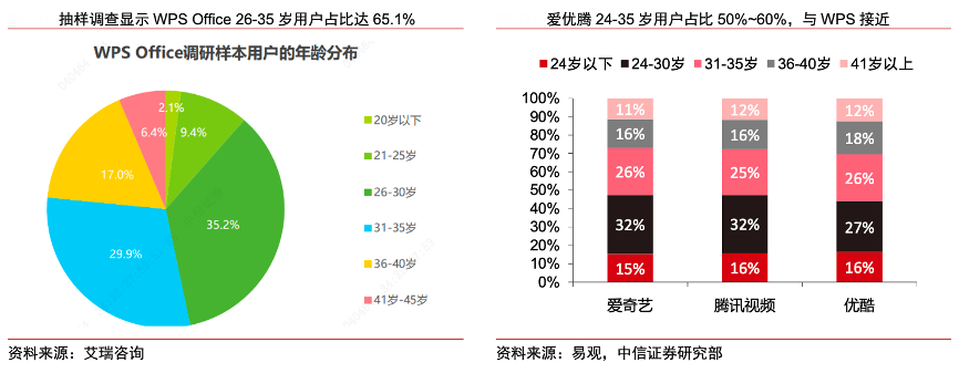 經(jīng)典案例:根據(jù)艾瑞咨詢、易觀、中信證券研究部等綜合資訊表明,愛奇藝、優(yōu)酷、騰訊視頻”等網(wǎng)絡(luò)視頻應(yīng)用與 WPS 均為跨終端應(yīng)用;均主要通過小額支付方式付費,年訂閱費用在 200 元上下,與 WPS 超級會員 179 元年費價格接近;易觀數(shù)據(jù)顯示,“愛優(yōu)騰”24-35歲用戶占比在 50%~60%之間,與 WPS 26-35 歲用戶 65%的用戶年齡結(jié)構(gòu)相似。