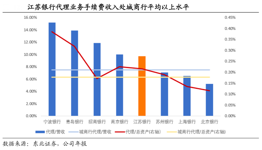經典案例:根據(jù)東北證券、公司年報等綜合資訊表明,江蘇銀行針對三類客群進行差異化管理,從覆蓋內容和覆蓋深度兩方面 提升客戶的價值貢獻。一是理財客戶,零售 AUM30 萬到 200 萬左右,關注公募基金及保險產品,市場空間大;二是財富客戶,零售 AUM200 萬到 600 萬,關注私募 基金及高端理財,提升單位 AUM 價值貢獻;三是私人銀行客戶,零售 AUM600 萬 以上,充分挖掘家族信托等深層需求。江蘇銀行理財、代銷等中收快速增長,2020 年代理中收為 44.10 億元,代理業(yè)務手續(xù)費收入占 比營收 9.7%,僅次于寧波、南京和青島銀行。