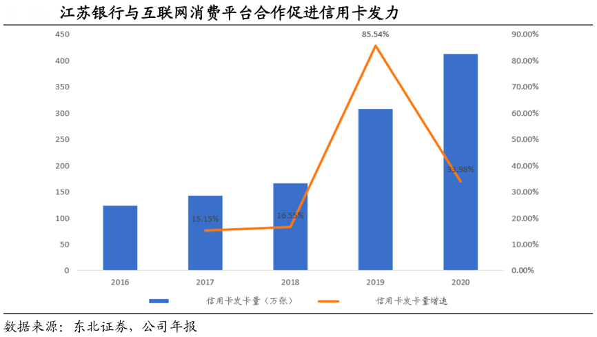 經典案例:根據(jù)東北證券、公司年報等綜合資訊表明,江蘇銀行提出“分層”+“分群”的客戶服務方式,其在拓客獲客上,通過深入網點周邊社區(qū)拓展基礎客群,通過對公小微業(yè)務聯(lián)動挖掘中高端客群,通過消費場景平臺合作轉化財富客戶,均取得較好承銷。江蘇銀行信用卡通過與美團等互聯(lián)網平臺合作獲客,發(fā)卡量近五年不斷上升。截至 2020 年,信用卡發(fā)卡量達到 413萬張,已達到業(yè)內認為的 300 萬張盈虧平衡點。