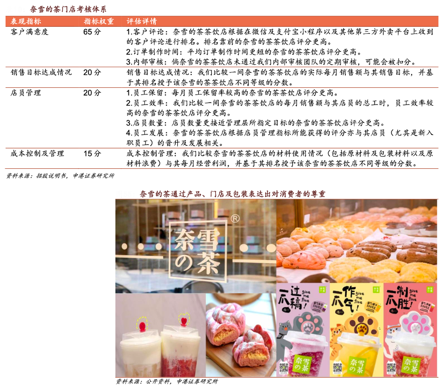 經(jīng)典案例:根據(jù)招股說明書、公開資料、申港證券研究所等綜合資訊表明,奈雪的茶建立了一個綜合的表現(xiàn)評估體系及激勵機(jī)制(或稱 A 計劃體系),以此提 升客戶滿意度及門店的整體表現(xiàn)。A 計劃體系包含客戶滿意度、銷售目標(biāo)達(dá)成情 況、店員管理評級以及成本控制及管理評級等多項表現(xiàn)指標(biāo),其中客戶滿意度占 65 分、店員管理占20 分。2019 年 9 月,中國特定城 市(如深圳)首次推出 A 計劃體系,接著 2020 年 6 月在全國范圍內(nèi)推出。