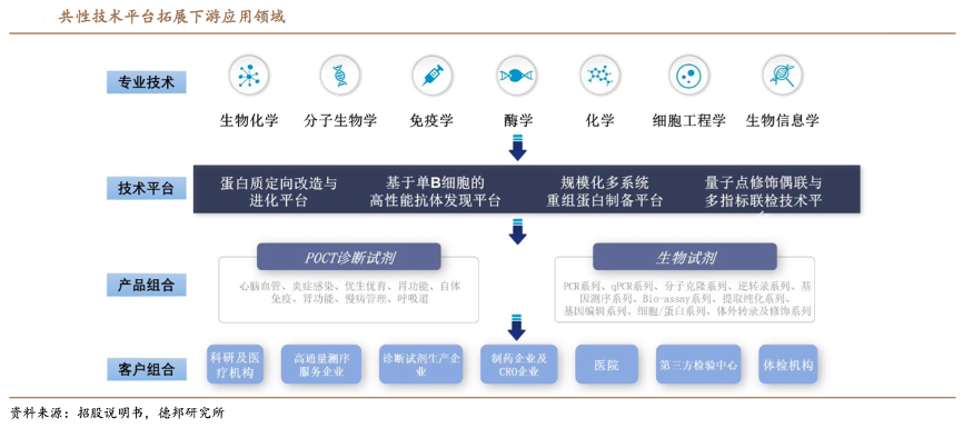 經(jīng)典案例:根據(jù)招股說明書、德邦研究所等綜合資訊表明,諾唯贊公司基于其獨立的技術(shù)平臺,拓展了廣泛的下游應(yīng)用領(lǐng)域。1)其推出包含 PCR 系列、qPCR 系列、分子克隆系列、逆轉(zhuǎn)錄系列等多個系列的生物試劑以及 包含心腦血管、炎癥感染、優(yōu)生優(yōu)育、胃功能等 8 個系列的 POCT 診斷試劑;2)形成了多重客戶群體組合:科研院校、高通量測序服務(wù)企業(yè)、分子診斷試劑生產(chǎn) 企業(yè)、制藥企業(yè)、CRO 企業(yè)、醫(yī)院等醫(yī)療機構(gòu)。