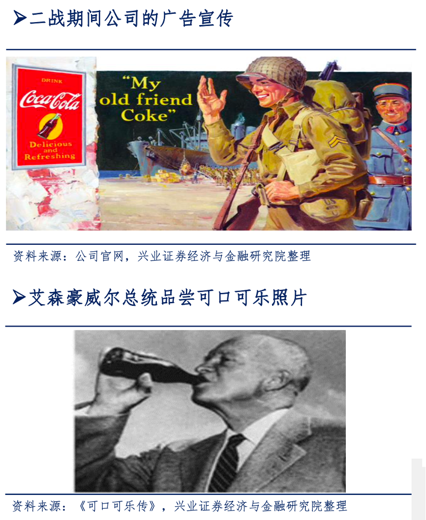 經(jīng)典案例:根據(jù)公司官網(wǎng)、《可口可樂傳》、興業(yè)證券經(jīng)濟與金融研究院等綜合資訊表明,可口可樂在戰(zhàn)時積極宣傳營銷其對美軍作戰(zhàn)做出的貢獻,樹立了深入人心的愛國形象,這正迎合了戰(zhàn)爭時期民眾高漲的愛國熱情,使得可口可樂 進一步成為了美國人心中的“國民飲料”。其為了凸顯產(chǎn)品的“美國”概念,常常邀請美國政府官員,尤其是各位總統(tǒng)品嘗可口可樂,并將照片加以宣傳,這更是使得可口可樂成為美國二戰(zhàn)后的一張閃亮的“名片”。