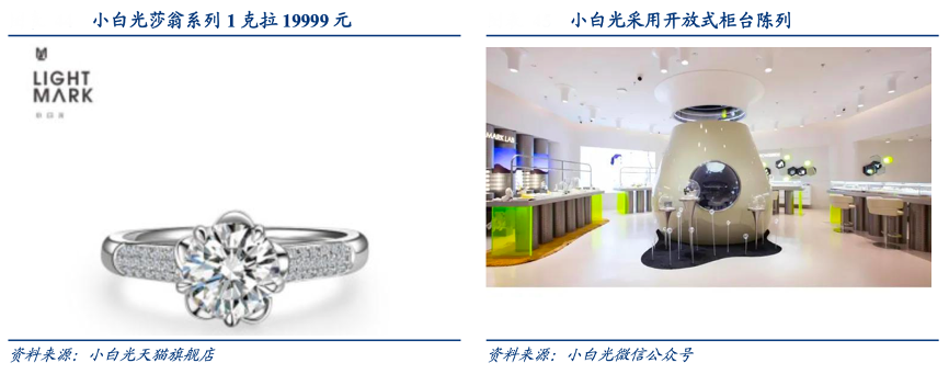 經(jīng)典案例:根據(jù)小白光天貓旗艦店、小白光微信公眾號(hào)、華創(chuàng)證券等綜合資訊表明, 2020年小白光正式推出,2021 年 1 月其在上海開(kāi)設(shè)首家線下門(mén)店,小白光提供以 HPHT 法生產(chǎn)的培育鉆石,推出終端售價(jià)為 19999 元的 1 克拉鉆戒的主打產(chǎn)品,希望基于材料創(chuàng)新、 提供高性?xún)r(jià)比、更環(huán)保的鉆石產(chǎn)品,實(shí)現(xiàn)年輕人可負(fù)擔(dān)的奢侈,打造屬于 Z 時(shí)代的“克拉自由”。