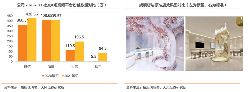 經(jīng)典案例:根據(jù)招股說明書、天風證券研究所等綜合資訊表明,2021 年初,DR 在微信、微博、抖音、快手粉絲分別達 428.56 萬人、405.57 萬人、196.5 萬人、84.5 萬人,分別同比變動18.87%、-0.76%、77.83%、1436.36%,其中短視頻平臺的粉絲增速尤為迅猛。在短視頻超越即時通訊類 APP 成為移動互聯(lián)網(wǎng)第一流量入口與 DR 在短視頻類別上大幅增加推廣費用的雙層助力下,DR品牌得到了顯著的推廣效果,形成良好品牌傳播效果。