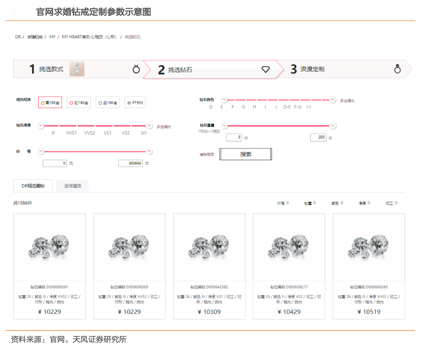 經(jīng)典案例:根據(jù)官網(wǎng)、天風證券研究所等綜合資訊表明,對于求婚鉆戒、結(jié)婚對戒產(chǎn)品,消費者在現(xiàn)有產(chǎn)品系列中選擇商品款式后,根據(jù)自身需求確定鉆石參數(shù)、戒托材質(zhì)、手寸大小及個性化刻字需求等定制內(nèi)容,定制周期一般不超過 30 天,增強產(chǎn)品的唯一性和獨特性。迪阿股份公司借助該模式以及供應(yīng)鏈的高效運作實現(xiàn)“以需定產(chǎn)”,快速捕捉消費者喜好及流行趨勢的變動,保持較低存貨水平、較低的開店成本及良好的現(xiàn)金流。