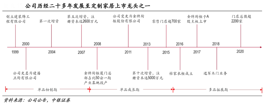 經(jīng)典案例:根據(jù)公司公告、中銀證券等綜合資訊表明,隨著地產(chǎn)市場(chǎng)逐漸進(jìn)入飽和階段,金牌櫥柜公司保持開(kāi)店力度同時(shí)拓寬產(chǎn)品維度以順應(yīng)行業(yè)趨勢(shì),其于2016年開(kāi)啟衣柜業(yè)務(wù),探索第二成長(zhǎng)曲線。2018年,其進(jìn)軍木門(mén)業(yè)務(wù)。2020年,其門(mén)店總數(shù)超 2200 家,營(yíng)業(yè)收入達(dá) 26.4 億元。其已形成廚柜業(yè)務(wù)穩(wěn)健增長(zhǎng),衣柜、木門(mén)快速發(fā)展的產(chǎn)品布局。