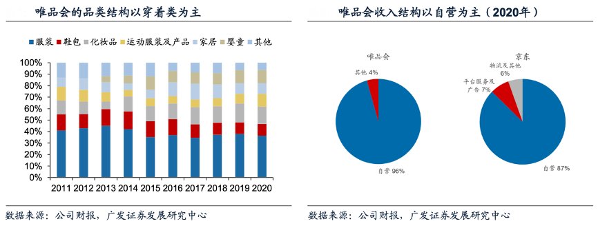 經(jīng)典案例:根據(jù)公司財報、廣發(fā)證券發(fā)展研究中心等綜合資訊表明,唯品會于2008年8月成立,同年12月旗下網(wǎng)站上線,率先在中國開啟“品牌折扣+限時搶購+正品保障”的品牌特賣模式。2020年,唯品會穿著類產(chǎn)品占比約58%(服裝36%+ 鞋包10%+運動類11%),由女性用戶消費場景延伸,化妝品(15%)、嬰童(12%) 家居(9%)也已成為重要銷售品類。唯品會自營進銷為主,2020年自營收入占比95.7%。