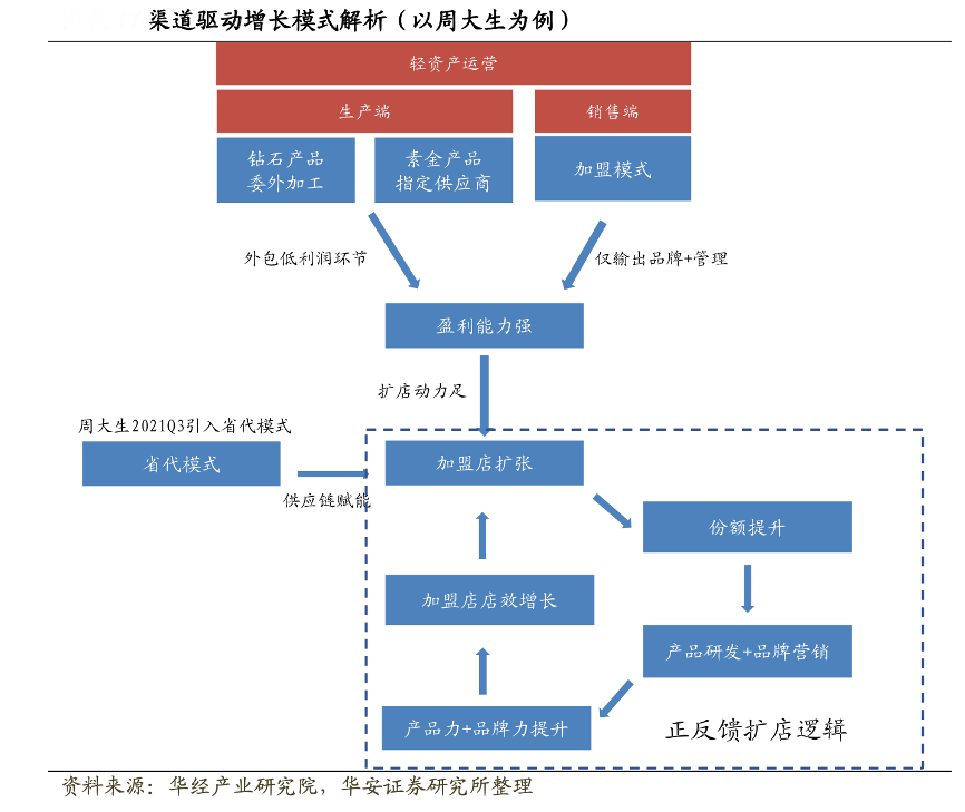 經(jīng)典案例:根據(jù)華經(jīng)產(chǎn)業(yè)研究院、華安證券研究所等綜合資訊表明,周大生通過“經(jīng)營模式+運(yùn)營管理”上的差異化,逐步建立起自身渠道優(yōu)勢以及步入產(chǎn)品、品牌持續(xù)提升的正反饋通道。(1)經(jīng)營模式上,周大生采用生產(chǎn)端委外加工+指定供應(yīng)商、銷售端加盟為主的輕資產(chǎn)模式,實(shí)現(xiàn)盈利能力顯著高于同業(yè);(2)運(yùn)營管理上,周大生由于外包低利潤、重資產(chǎn)環(huán)節(jié),強(qiáng)盈利能力為渠道擴(kuò)張?zhí)峁┏渥銊?dòng)力,渠道優(yōu)勢顯著。