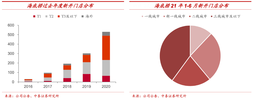經(jīng)典案例:根據(jù)公司公告、中泰證券研究所等綜合資訊表明,2020年之前,三 線城市海底撈門(mén)店只有不到 200 家。近年來(lái),海底撈開(kāi)始發(fā)力下沉市場(chǎng),2021H1,海底撈在一、二、三線城市新開(kāi)的門(mén)店數(shù)量分別為 75 家、204 家和 344 家,在三線新開(kāi)的門(mén)店數(shù)量超過(guò)在一、二線城市新開(kāi)門(mén)店數(shù)量的總和。門(mén)店下沉可以有效控制門(mén)店租金、人工壓力,與此同時(shí),發(fā)力下沉市場(chǎng)也可緩解核心市場(chǎng)開(kāi)店壓力。