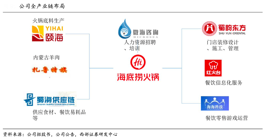 經(jīng)典案例:根據(jù)公司招股書(shū)、公司公告、西部證券研發(fā)中心等綜合資訊表明,為了滿足門(mén)店的擴(kuò)張需求以及供應(yīng)鏈流程的標(biāo)準(zhǔn)化、可控化,海底撈在內(nèi)部設(shè)立了供應(yīng)鏈管理部門(mén)、人力資源招聘及培訓(xùn)部門(mén)、新門(mén)店裝修及維護(hù)部門(mén)以及火鍋底料生產(chǎn)基地,并于2015年前后將過(guò)去服務(wù)于海底撈內(nèi)部的供應(yīng)鏈及開(kāi)店支持部門(mén)逐步獨(dú)立出來(lái),分別成立頤海國(guó)際(火鍋底料生產(chǎn)企業(yè),1579.HK)、蜀海集團(tuán)(供應(yīng)鏈服務(wù)企業(yè))、蜀韻東方(門(mén)店設(shè)計(jì)裝飾企業(yè))、微海咨詢(人力招聘及培訓(xùn)咨詢)、紅火臺(tái)(與用友成立合資公司,專(zhuān)注于餐飲信息化)以及海??萍?餐飲零售游戲開(kāi)發(fā))等。獨(dú)資或合資公司目前已經(jīng)從“內(nèi)部服務(wù)”走向“外部+內(nèi)部”雙向服務(wù),市場(chǎng)化經(jīng)營(yíng)環(huán)境下服務(wù)、管理能力得到完善和升級(jí)。