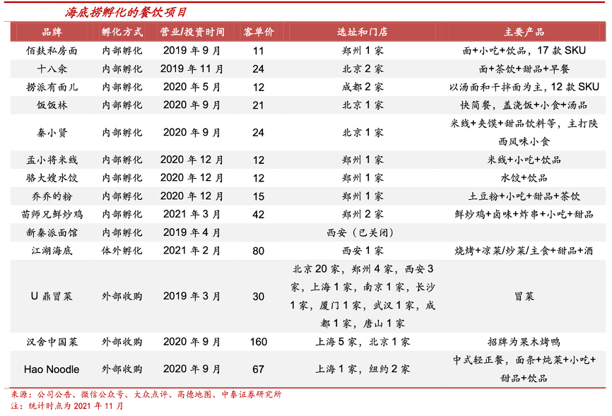 經(jīng)典案例:根據(jù)公司公告、微信公眾號、大眾點評、高德地圖、中泰證券研究所等綜合資訊表明,近年來,海底撈不斷根據(jù)市場走向,圍繞行業(yè)趨勢、產(chǎn)品趨勢,切入熱門賽道,搶占市場流量。2019 年下半年以來,海底撈連續(xù)推出了秦小賢、撈派有面兒、十八汆、佰麩私房面、孟小將、駱大嫂、飯飯林、制茶樂園、喬喬的粉、苗師兄鮮炒雞等多個子品牌。2020 年底,海底撈在北京開出了首家火鍋食材超市。海底撈經(jīng)過多年沉淀目前已經(jīng)形成了縱向一體化的餐飲供應(yīng)鏈產(chǎn)業(yè)集團,依托其現(xiàn)有的供應(yīng)鏈集成能力進行快餐品類的品牌集群孵化。