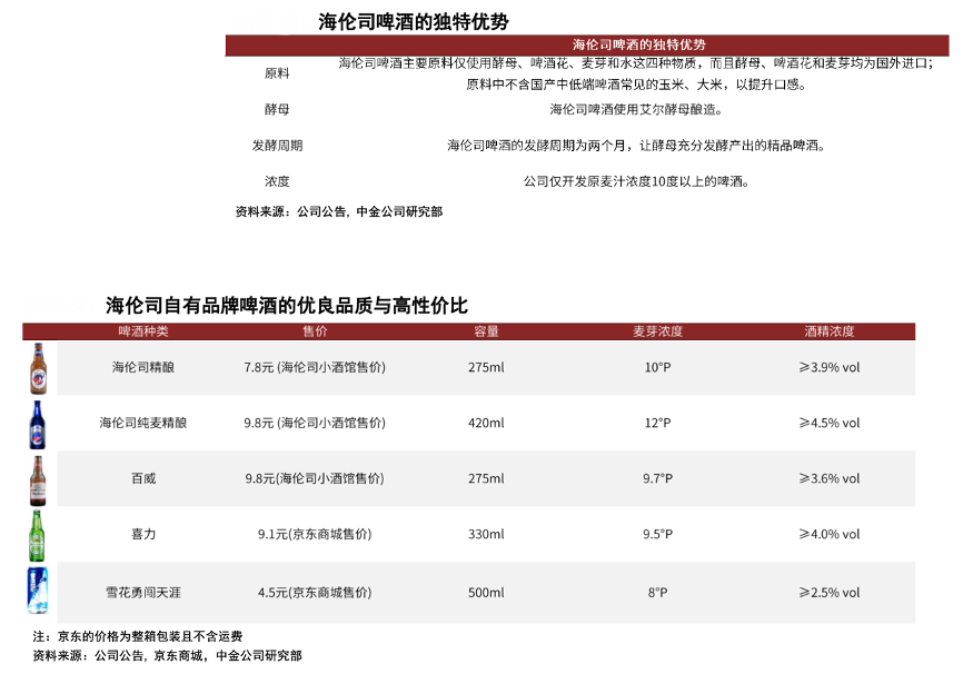 經(jīng)典案例:根據(jù)公司公告、京東商城、中金公司研究部等綜合資訊表明,海倫司公司對(duì)于自有品牌和第三方品牌酒飲,均提供具有競爭力的定價(jià)。所有瓶裝啤酒定價(jià)均在 10 元以下,使其在市場同類產(chǎn)品中具有明顯的價(jià)格優(yōu)勢。275ml 的海倫司精釀啤酒售價(jià)僅為7.8 元/瓶,價(jià)格與市場中品質(zhì)相似(基于酒精濃度和麥芽濃度) 的百威和喜力相似甚至更低。