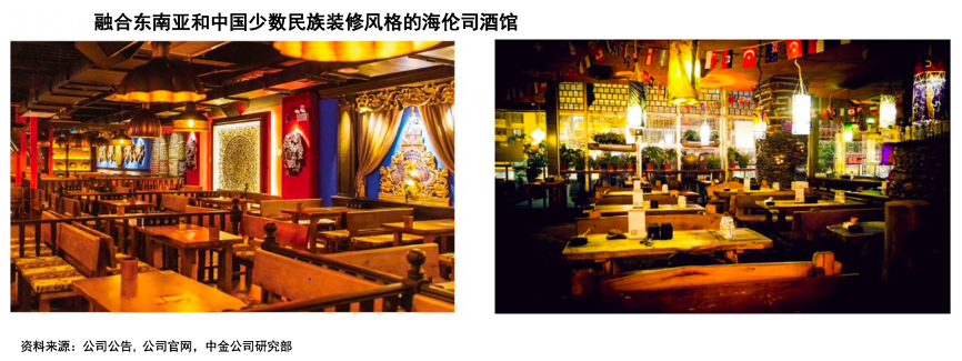 經(jīng)典案例:根據(jù)公司公告、公司官網(wǎng)、中金公司研究部等綜合資訊表明,海倫司在其所有的酒館中統(tǒng)一使用了融合東南亞和中國少數(shù)民族風(fēng)格的裝修。海倫司酒館以暖色調(diào)的飾品及燈光為特點(diǎn),并通過精心設(shè)計(jì)的玄關(guān)、門柱和藝術(shù)雕像等 裝飾,使顧客能夠在酒館中迅速放松下來,為其創(chuàng)造舒適的環(huán)境。同時(shí),公司持續(xù)更新酒館設(shè)計(jì),包括引入新裝飾風(fēng)格如歐式裝修風(fēng)格。