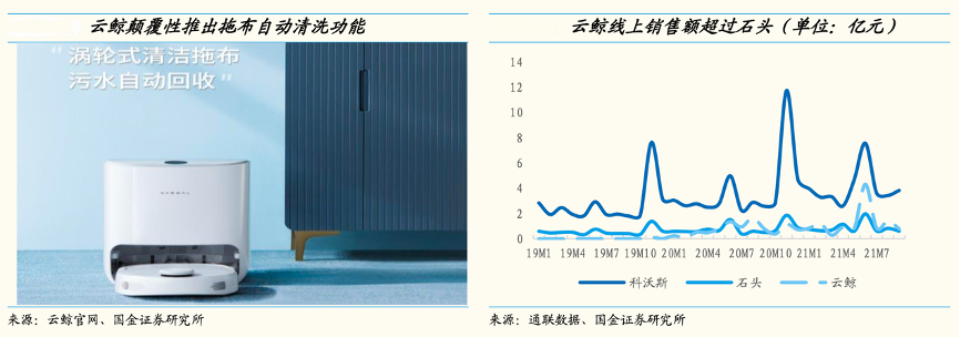 經(jīng)典案例:根據(jù)云鯨官網(wǎng)、通聯(lián)數(shù)據(jù)、國金證券研究所等綜合資訊表明,黑馬企業(yè)云鯨 2019 年推出行業(yè)內(nèi)第一款“能夠自動洗拖布”的掃拖一體機器人,帶動云鯨的市占率從 2019 年的 0.2%快速攀升至截至 2021 年 9 月的16.4%。云鯨僅憑 J1 一款產(chǎn)品即在行業(yè)中站穩(wěn)腳跟,超過石頭科技成為 掃地機器人市場線上銷售額市占率第二,根本原因在于“拖布自清潔”技術(shù)實 現(xiàn)了產(chǎn)品的差異化創(chuàng)新, 解決了機器人工作過后的手洗拖布問題,進一步解放了雙手。